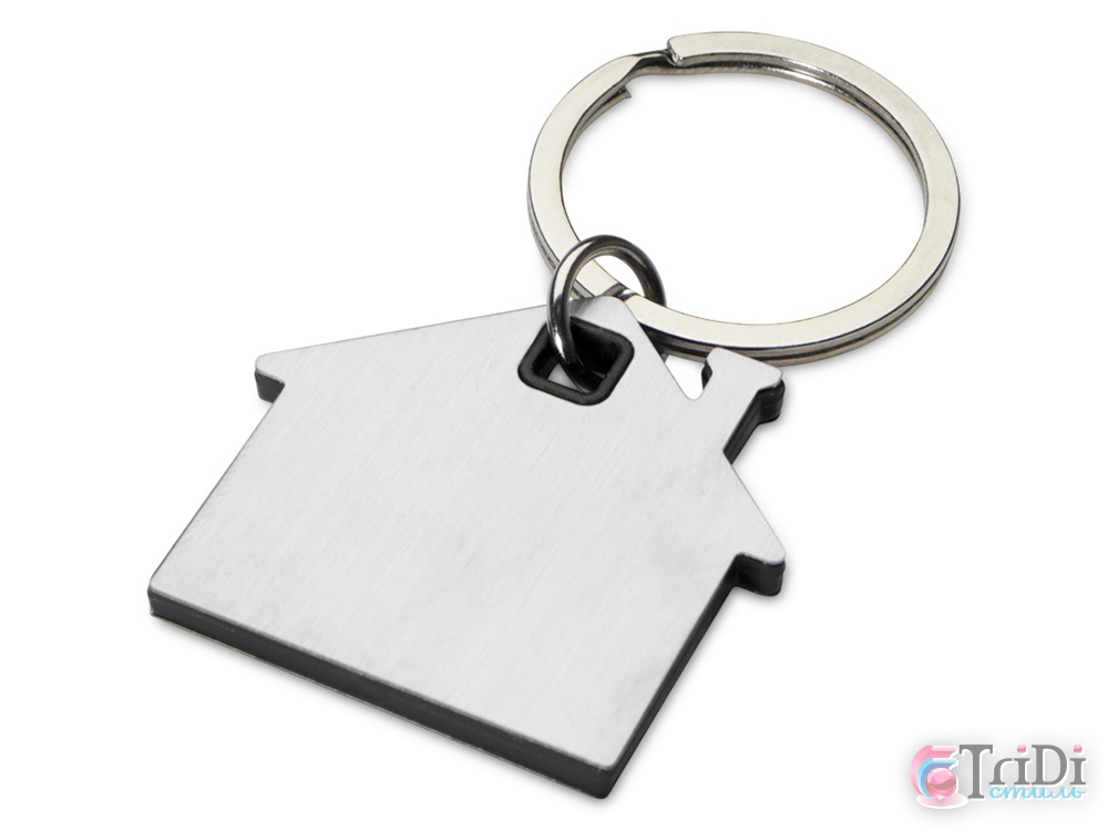Брелок для ключей в форме домика с цветной вставкой из пластика между 2-мя серебристыми пластинами из стали.