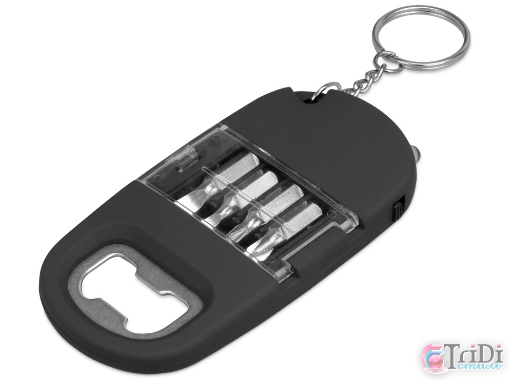 Брелок-открывалка с отвертками и фонариком Uni, софт-тач, черный (Р)