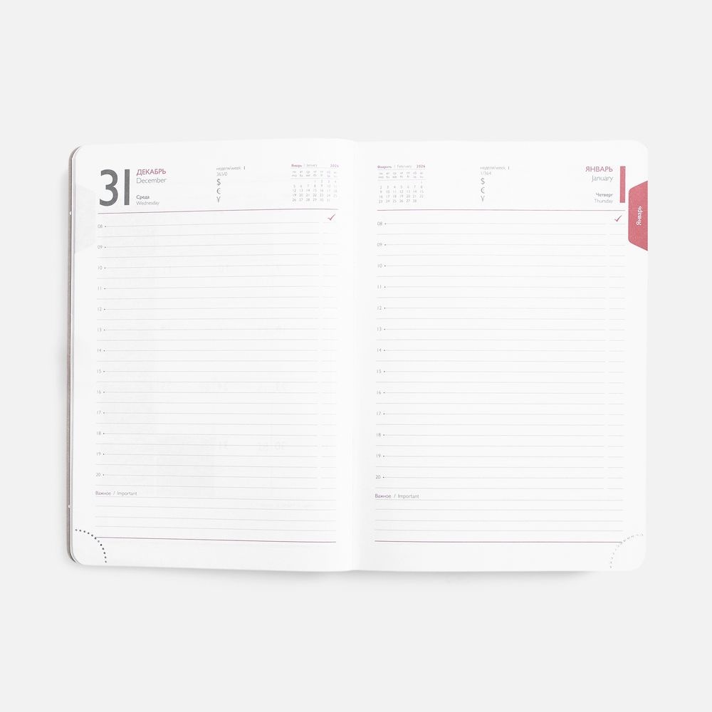 Ежедневник с твердой обложкой с поролоном из искусственной кожи Sarif, дополнен капталом и ляссе в цвет ежедневника. Блок c календарной сеткой и справочными материалами:Кол-во страниц — 352;Бумага — белая, плотность 70 г/м?.