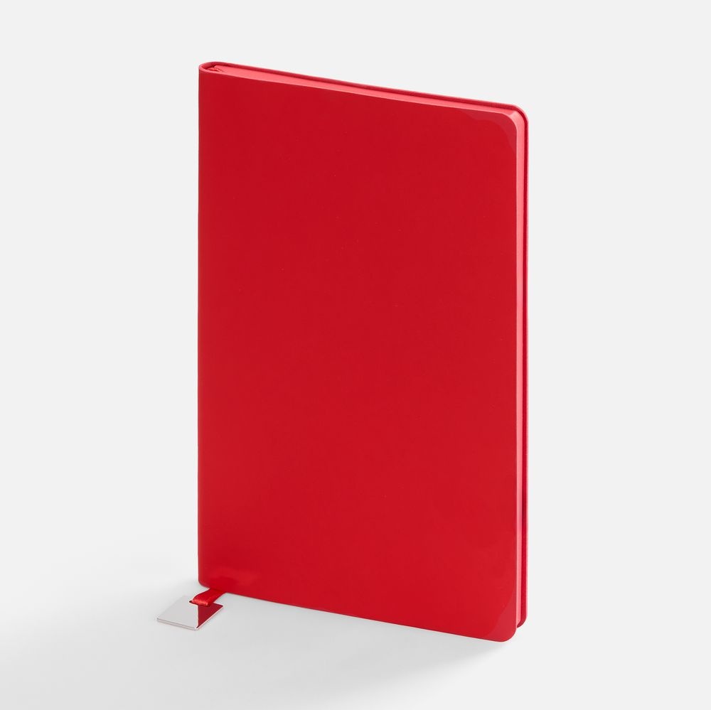 Ежедневник с гибкой обложкой, выполнен из материалов Soft Touch Ultra, красный РР, и Latte, красный (внутренняя часть обложки), дополнен ляссе в цвет обложки с металлическим шильдиком.