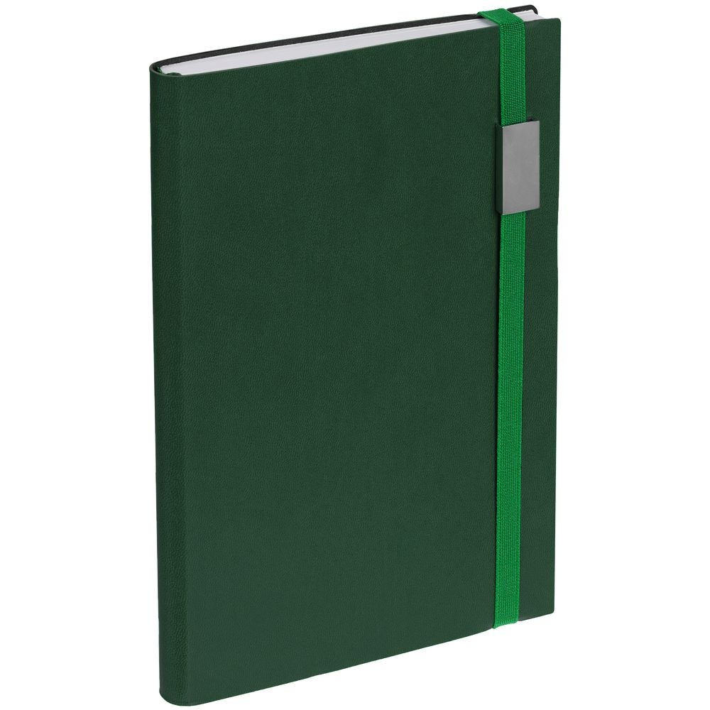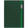 Ежедневник с гибкой обложкой, выполнен из материала Latte, зеленый FF, дополнен резинкой шириной 1 см с металлическим шильдом, капталом и ляссе зеленого цвета.
