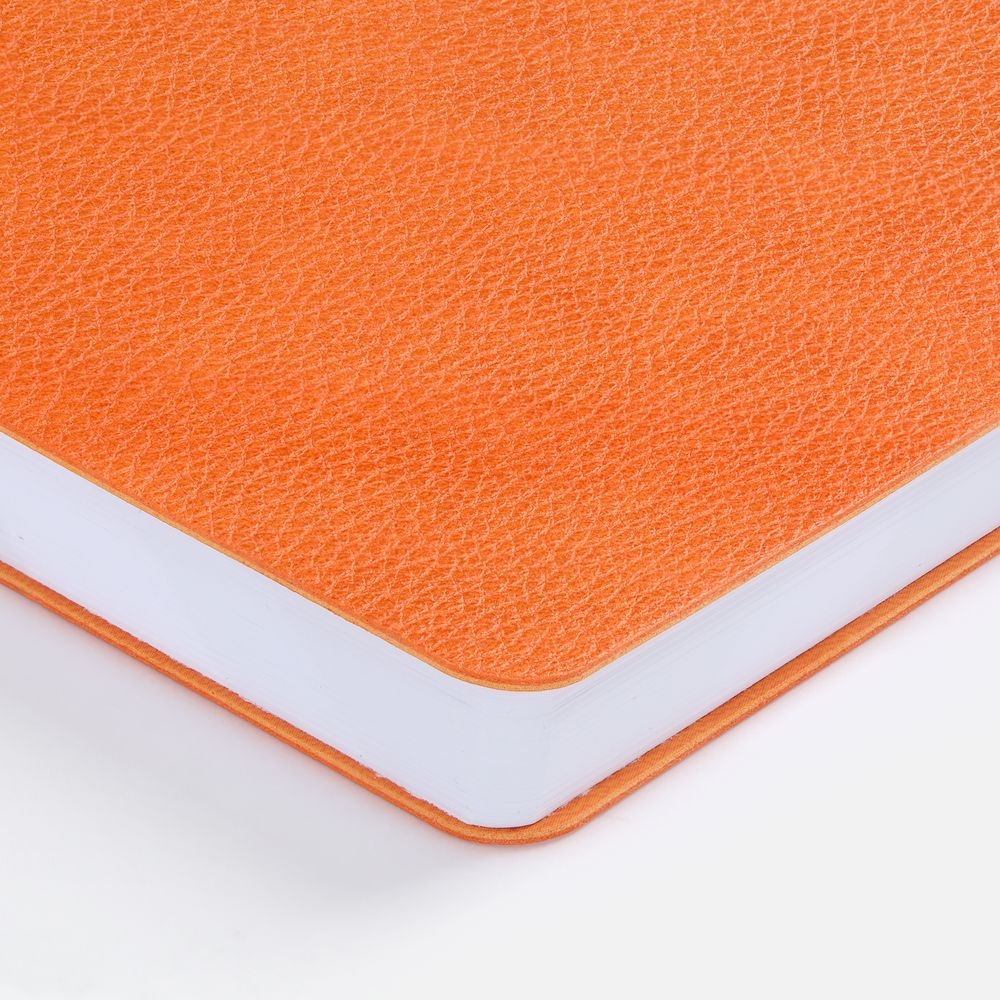 Ежедневник с гибкой обложкой, выполнен из материал La Fite, оранжевый ОО, дополнен ляссе в цвет обложки с металлическим шильдом.Блок 985, без календарной сетки и информационного блока:Кол-во страниц — 256;Бумага — белая, плотность 70 г/м?;Форзац и нахзац — белые.