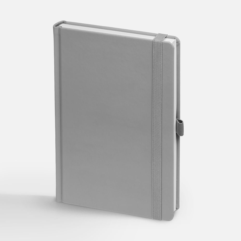 Ежедневник с твердой обложкой без поролона, выполнен из материала Soft Touch, серый СС, дополнен резинкой шириной 1 см, петлей-резинкой для ручки, капталом и ляссе серого цвета.