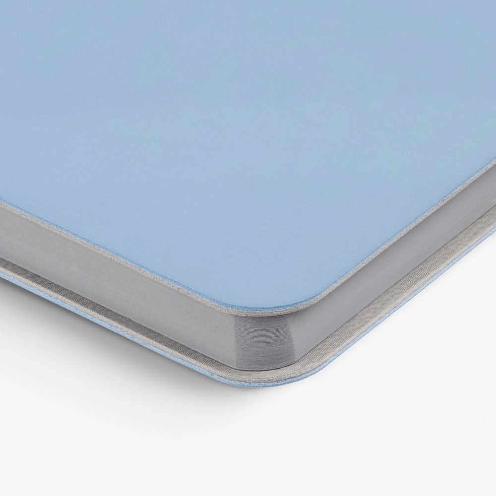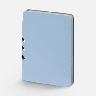 Ежедневник с гибкой обложкой выполнен из материала Soft Touch, голубой JJ и серого Latte (внутренняя часть обложки). Внутри корешка — специальное место для крепления ручки размером до 15х0,9 см.