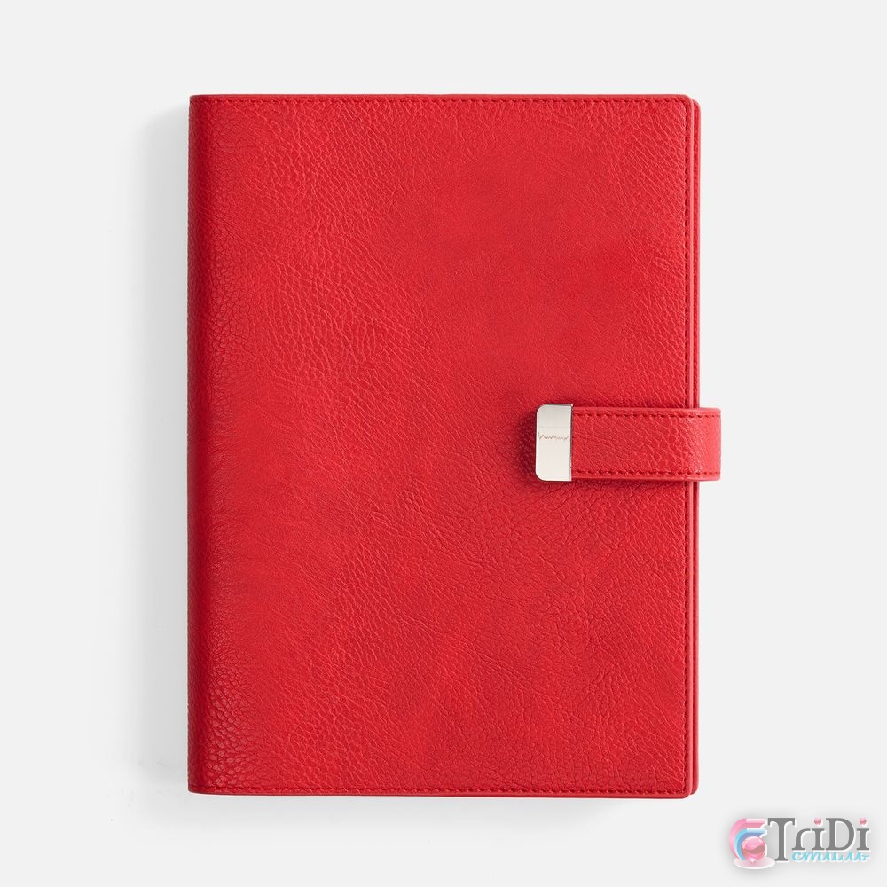 Ежедневник в мягком переплете со съемной обложкой, дополнен застежкой-хлястиком с металлическим шильдом на кнопке, двойным ляссе и капталом.