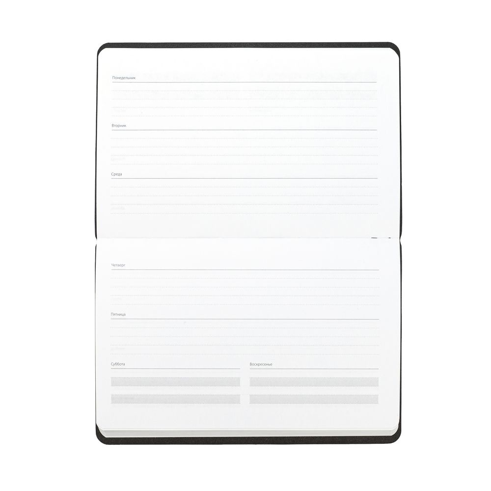 Еженедельник с гибкой обложкой, выполнен из материала Latte, красный РР.Блок 217, без календарной сетки и информационного блока:Кол-во страниц — 192;Бумага — белая, плотность 70 г/м?;Форзац и нахзац — белые.