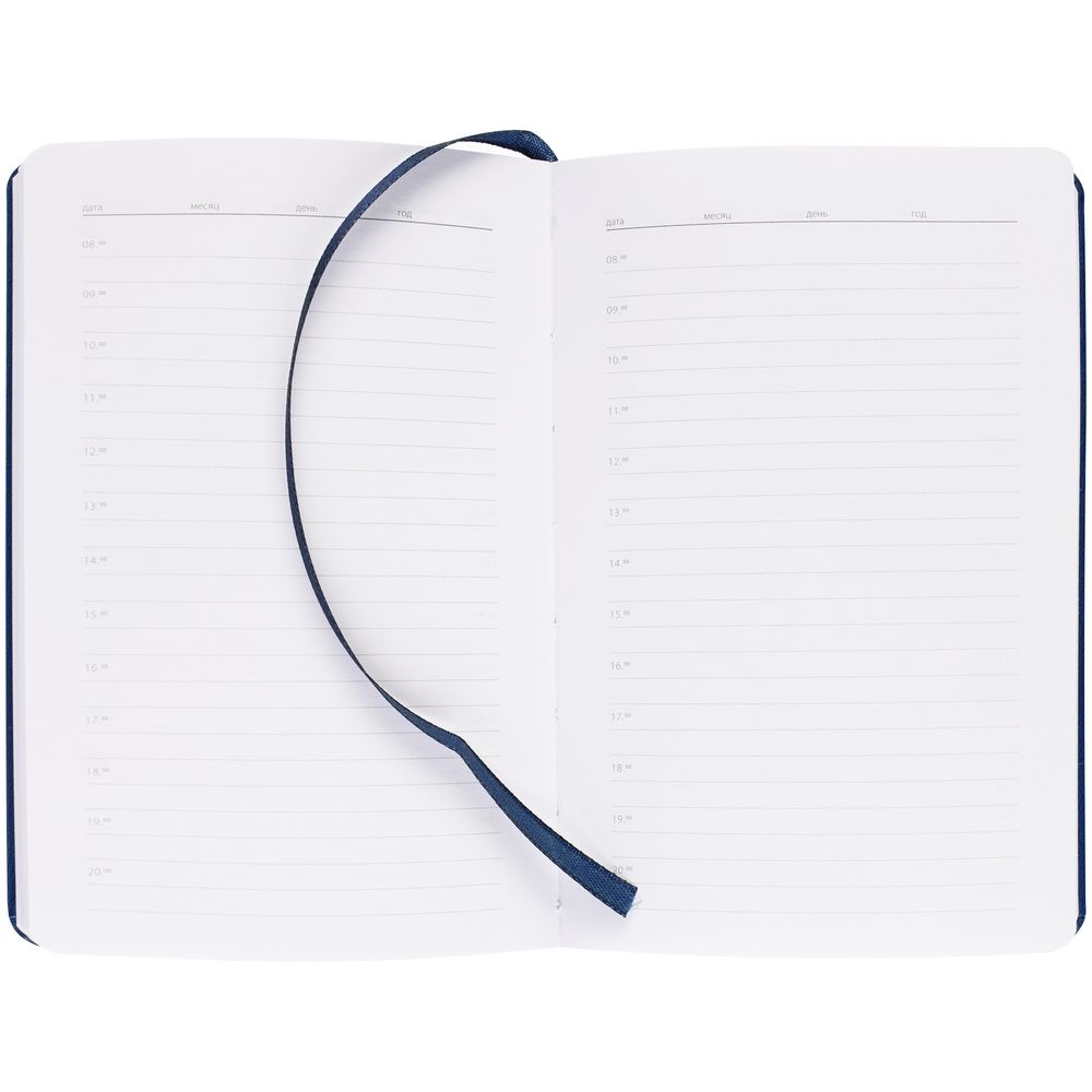 Ежедневник с твердой обложкой, выполнен из материала Latte, темно-синий ХХ, дополнен ляссе в цвет обложки.Блок 212, без календарной сетки и информационного блока:Кол-во страниц — 192;Бумага — белая, плотность 70 г/м?;Форзац и нахзац — белые.