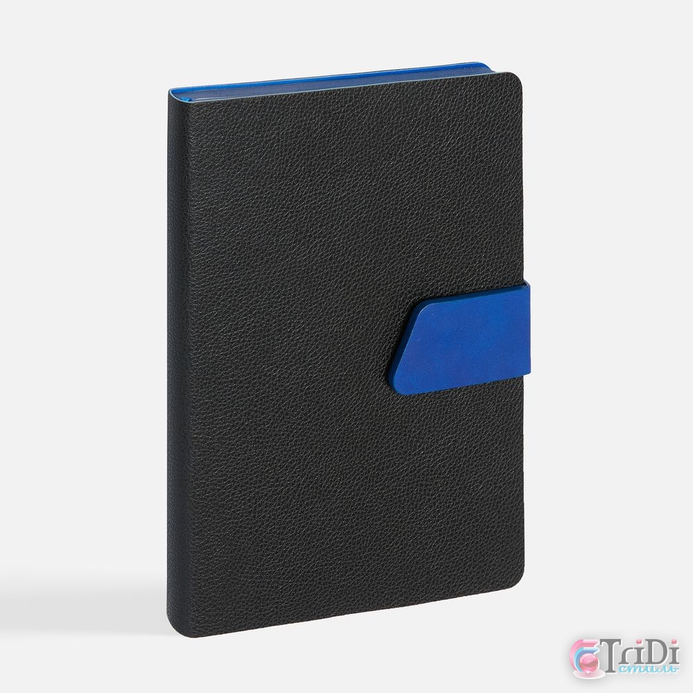 Ежедневник с гибкой обложкой, выполнен из материала La Fite, черный АА и Nubuck Touch, синий, дополнен синим ляссе и хлястиком на кнопке.Блок 985, без информационного блока:Кол-во страниц — 256;Бумага — белая, плотность 70 г/м?;Обрез блока — синий;Форзац и нахзац — белые.