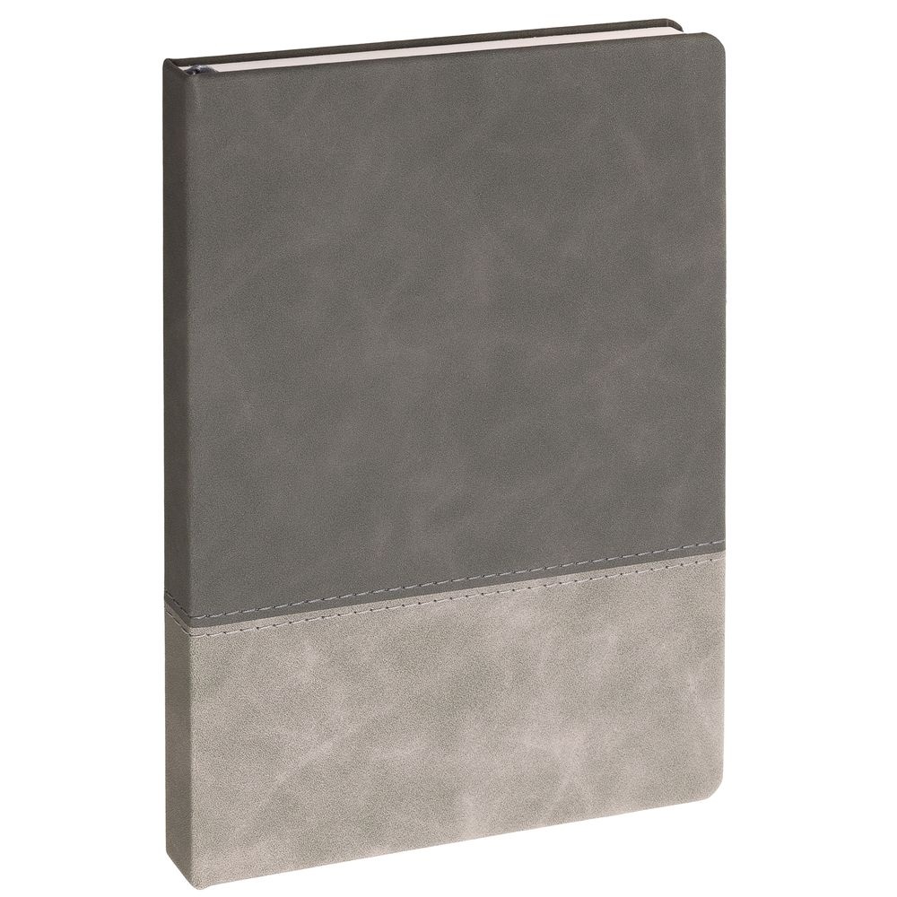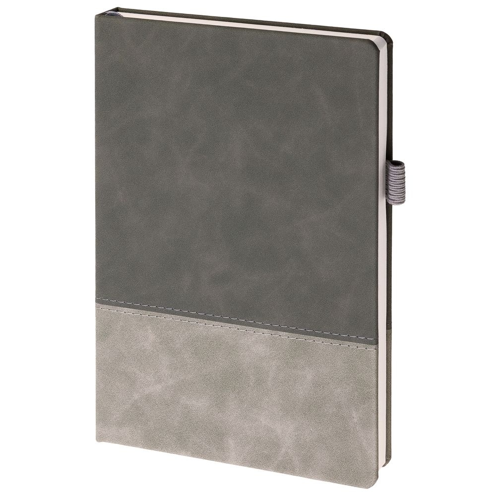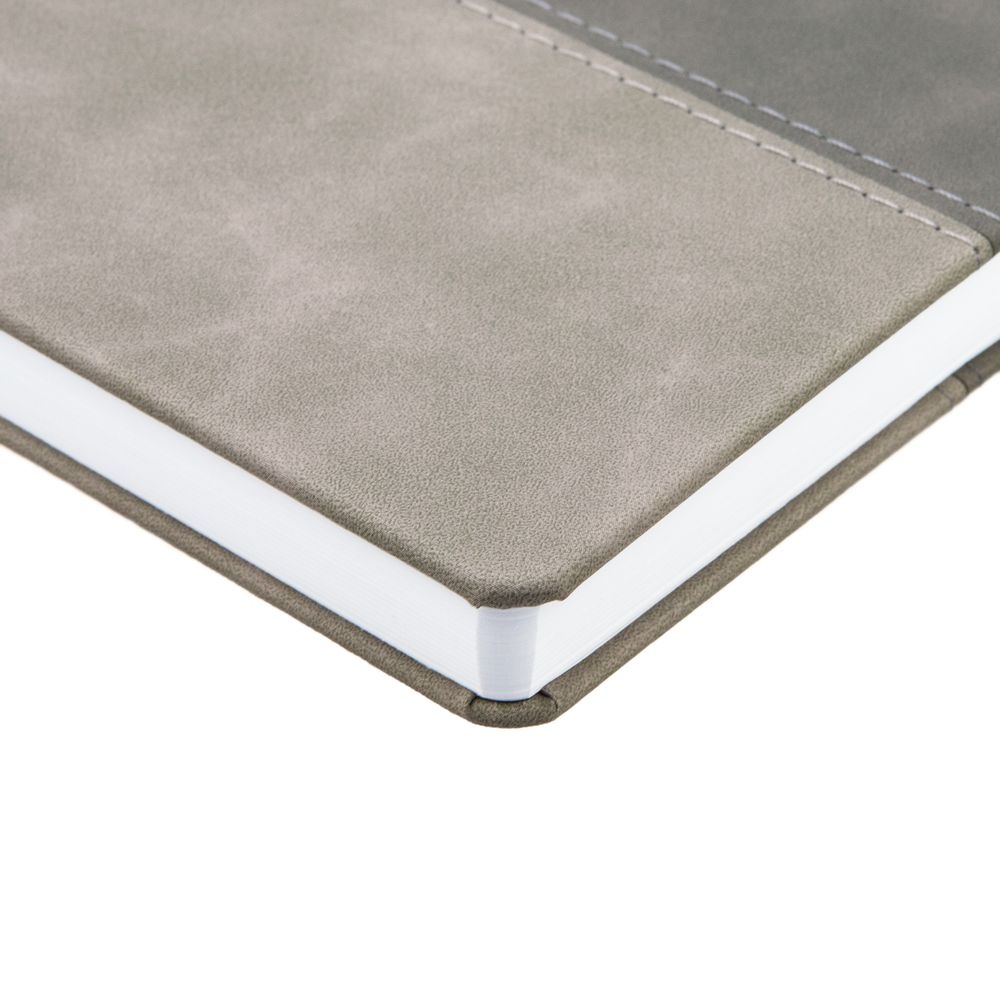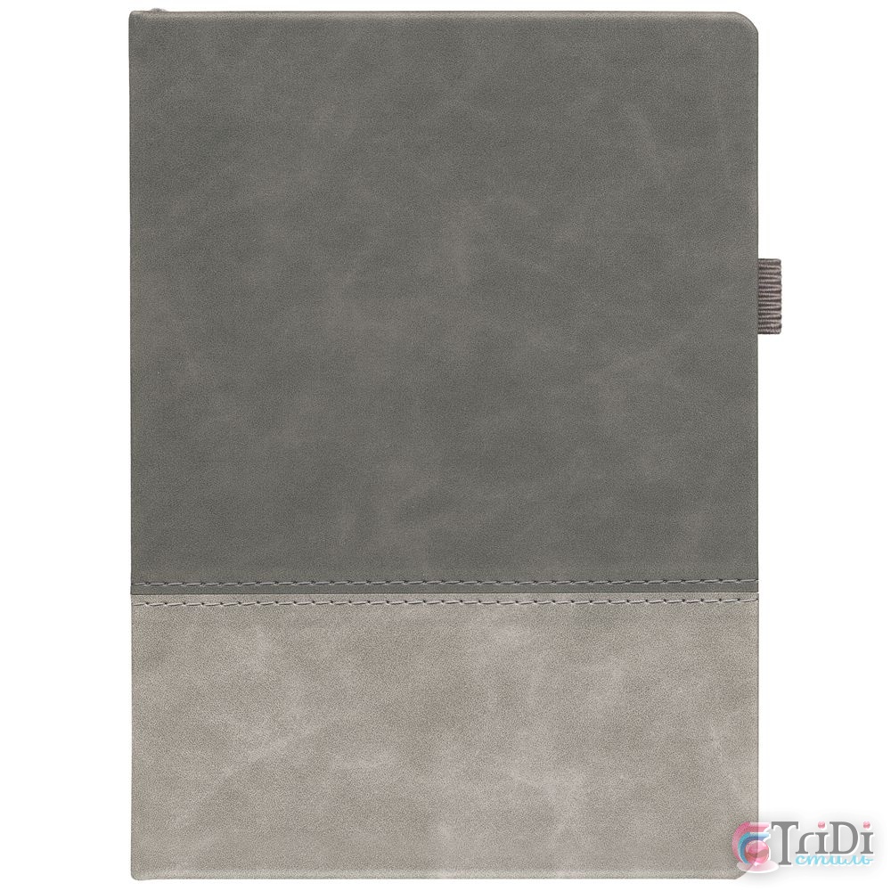 Ежедневник с твердой обложкой, без поролона, со сшивкой материалов Nubuck Touch серый СС, и Nubuck Touch тёмно-серый ЕЕ., дополнен двойным ляссе и петлей-резинкой для ручки.Блок 985, без календарной сетки и информационного блока:Кол-во страниц — 256;Бумага — белая, плотность 70 г/м?;Форзац и нахзац — белые.