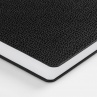 Ежедневник с гибкой обложкой, выполнен из материала La Fite, черный АА, дополнен ляссе в цвет обложки с металлическим шильдом.Блок 985, без календарной сетки и информационного блока:Кол-во страниц — 256;Бумага — белая, плотность 70 г/м?;Форзац и нахзац — белые.