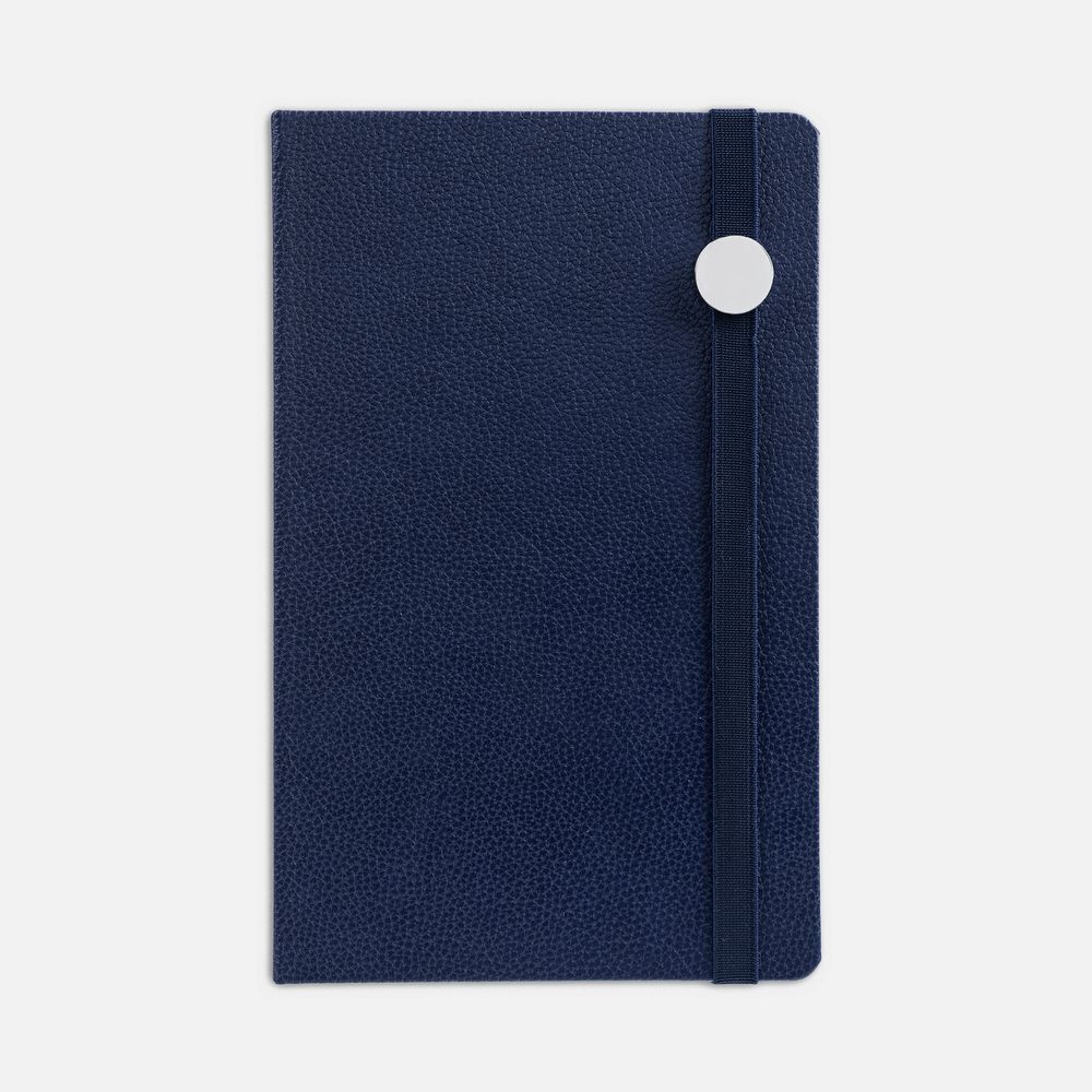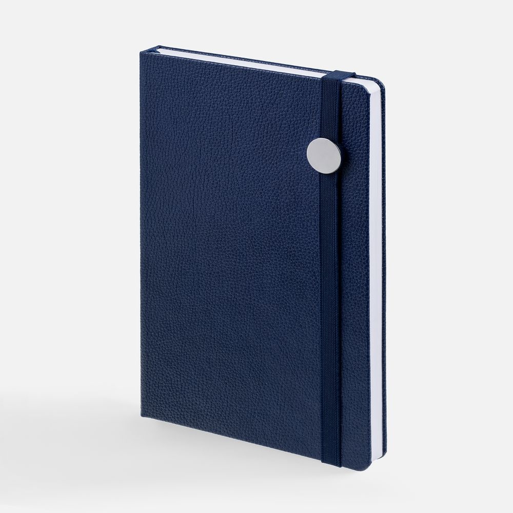 Зауженный ежедневник с круглым металлическим шильдом на резинке.