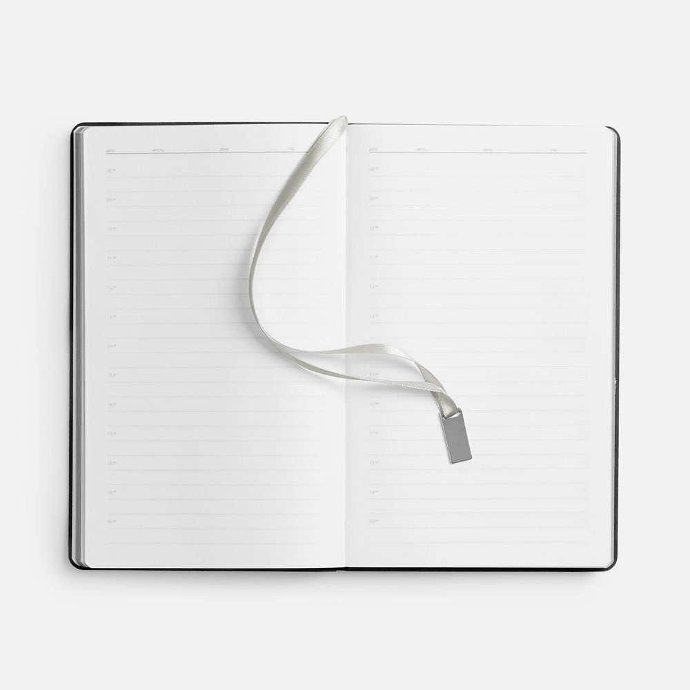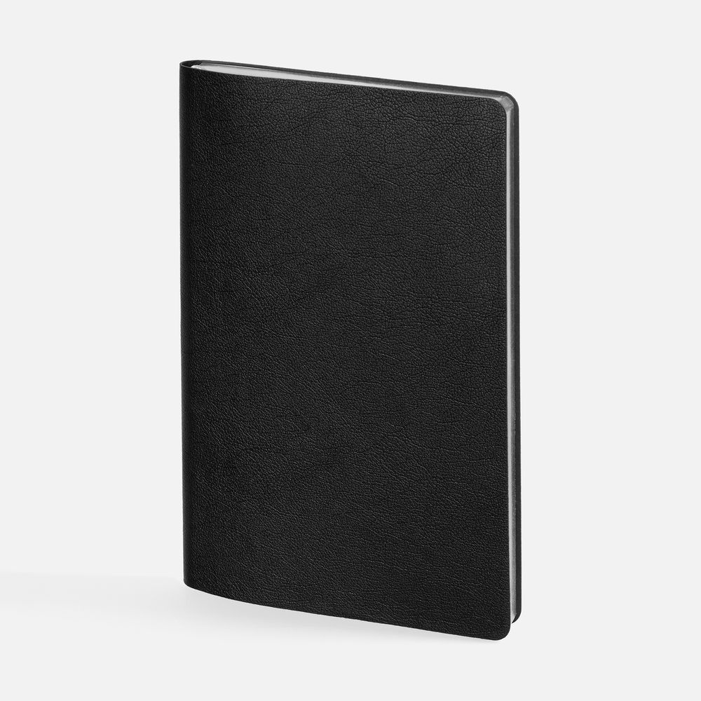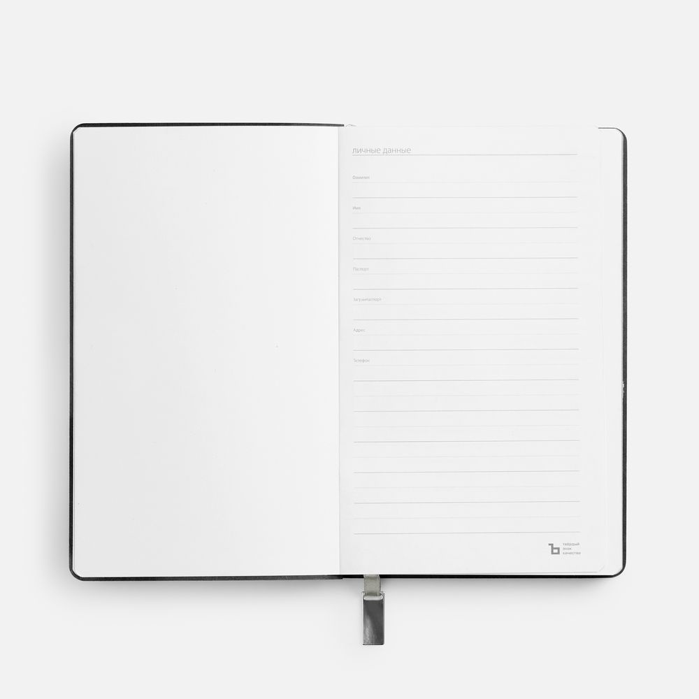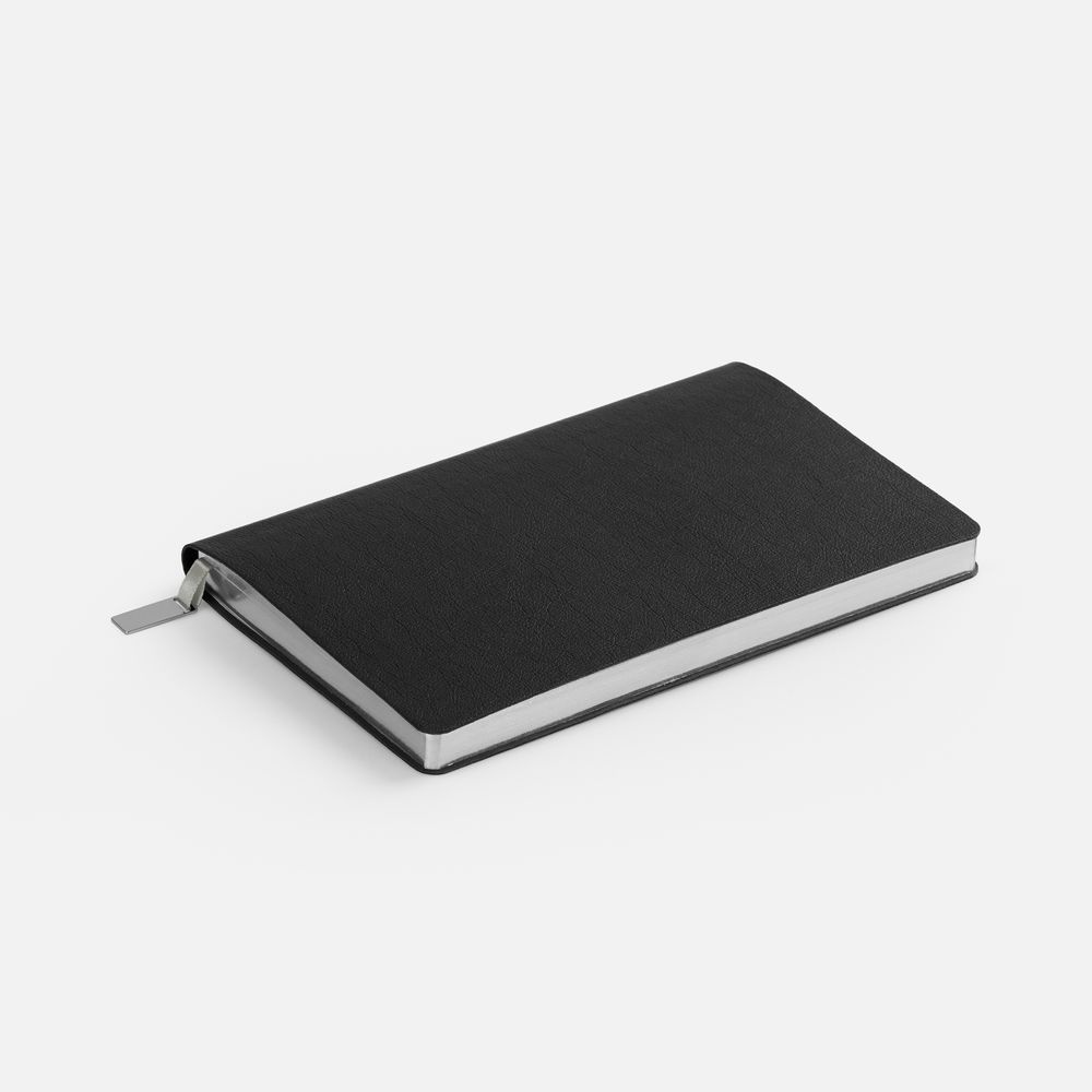 Ежедневник с гибкой обложкой, выполнен из материала Petrus, черный АА, дополнен серым ляссе с металлическим шильдиком.Блок 951, без календарной сетки и информационного блока: Кол-во страниц — 256;Бумага — белая, плотность 70 г/м?;Форзац и нахзац — белыеОбрез блока — серебристый.