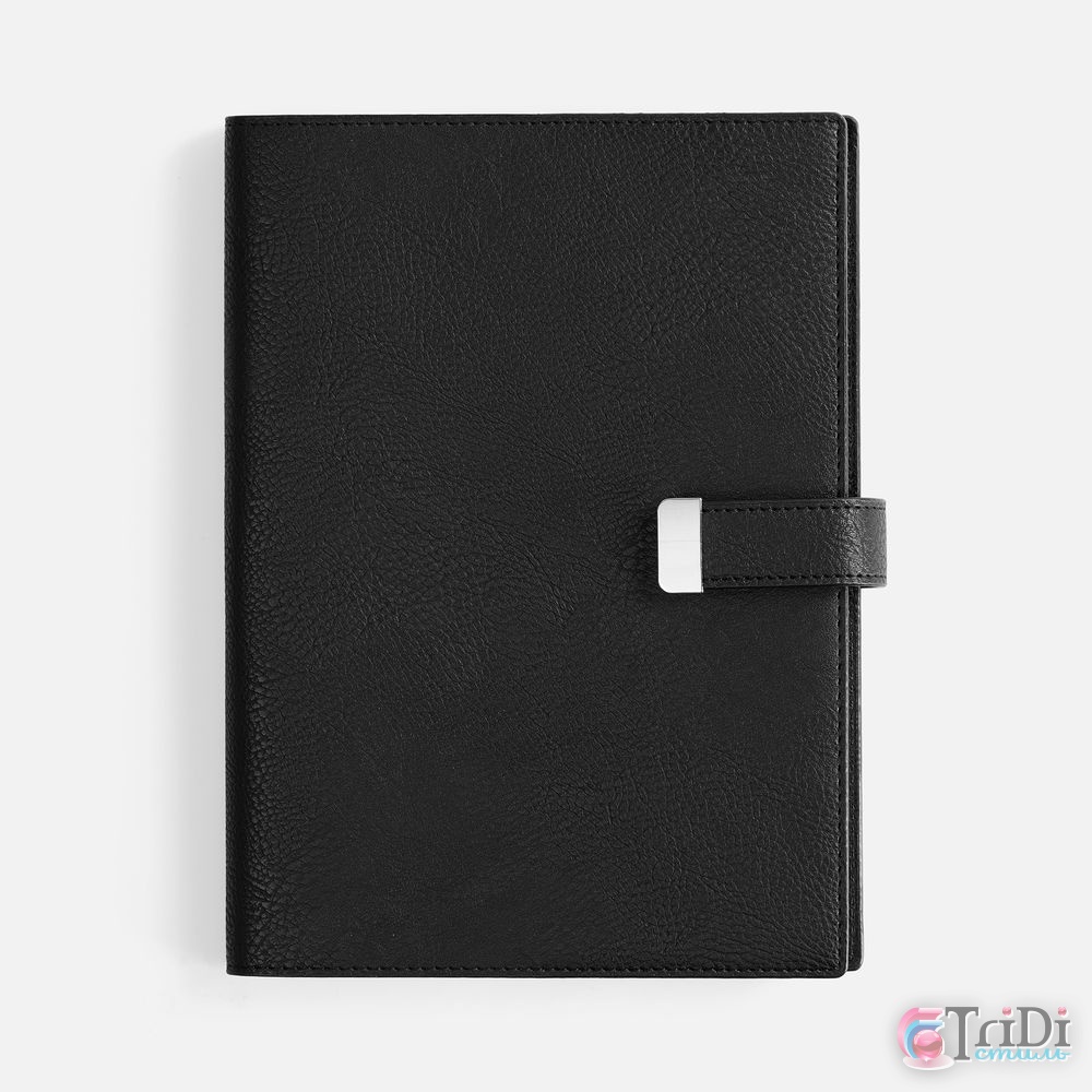 Ежедневник в мягком переплете со съемной обложкой, дополнен застежкой-хлястиком с металлическим шильдом на кнопке, двойным ляссе и капталом.