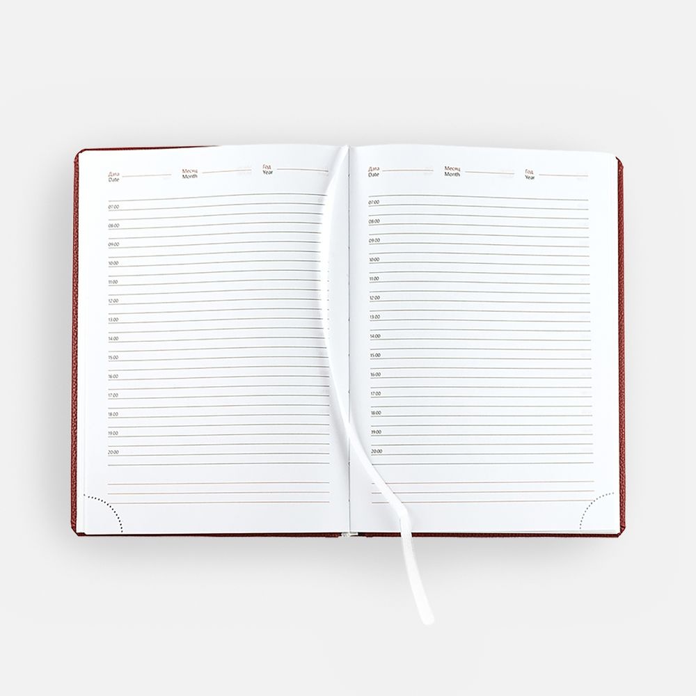 Ежедневник в твердой обложке c поролоном, выполнен из материала La Fite, красный РР, дополнен ляссе белого цвета.Блок 920:Кол-во страниц — 336;Бумага — белая, плотность 70 г/м?;Форзац и нахзац — белого цвета.