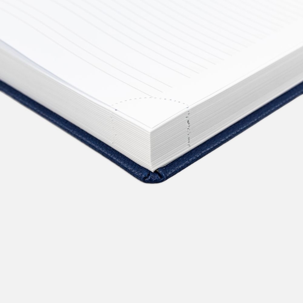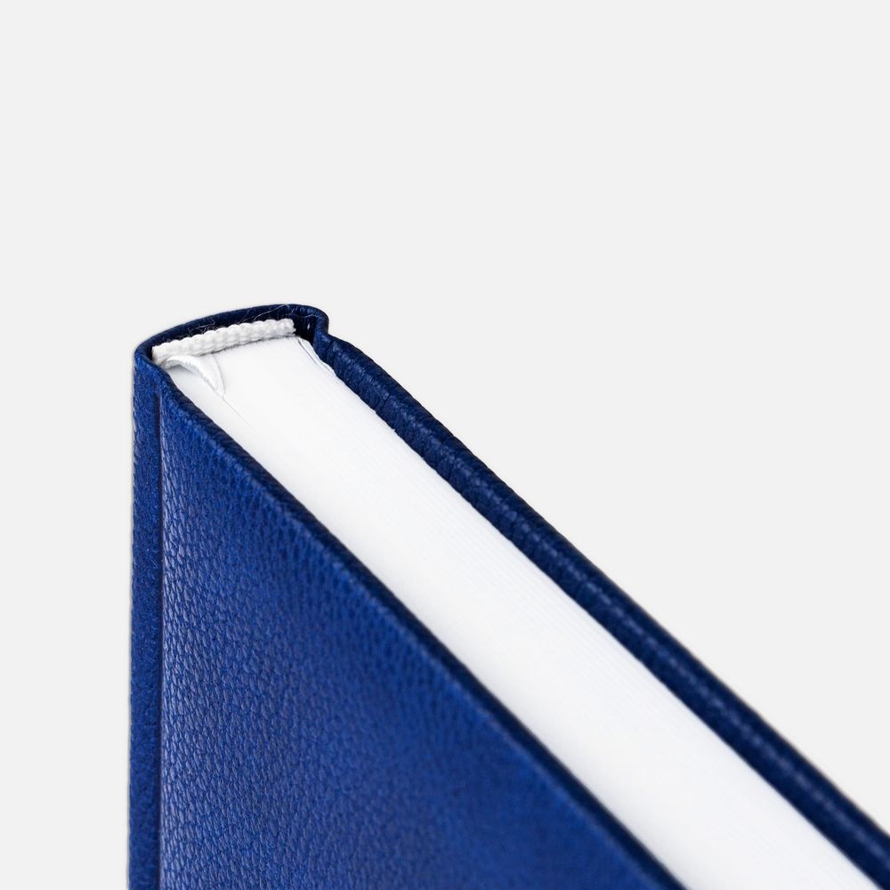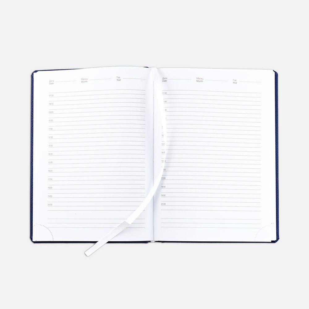 Ежедневник в твердой обложке c поролоном, выполнен из материала La Fite, синий НН, дополнен ляссе белого цвета.Блок 920:Кол-во страниц — 336;Бумага — белая, плотность 70 г/м?;Форзац и нахзац — белого цвета.