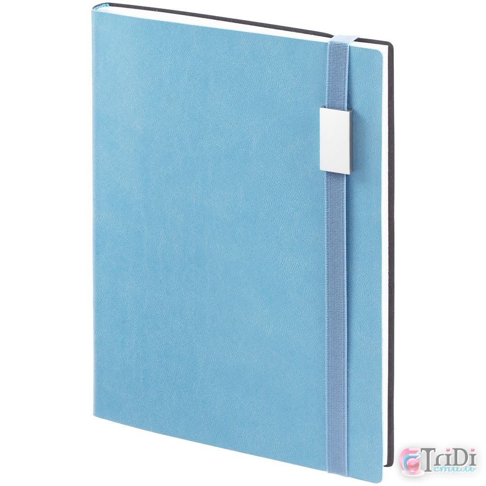 Ежедневник с гибкой обложкой, выполнен из материала Latte, голубой JJ, дополнен резинкой шириной 1 см с металлическим шильдом, капталом и ляссе голубого цвета.