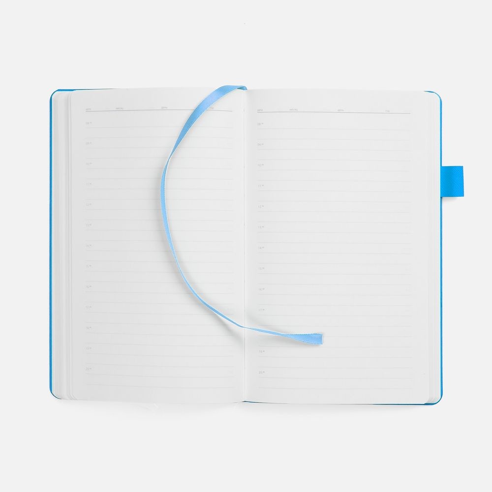 Гибкая обложка, материал обложки — Soft Touch, белый BB и Latte, голубойJJ; материал петли для ручки — Nice Touch, голубойJJ. Срез обложки окрашен в голубой цвет.Блок 951, без календарной сетки и информационного блока:Кол-во страниц — 256;Бумага — белая, плотность 70 г/м?;Форзац и нахзац — голубые.Ежедневник поставляется в термопленке.