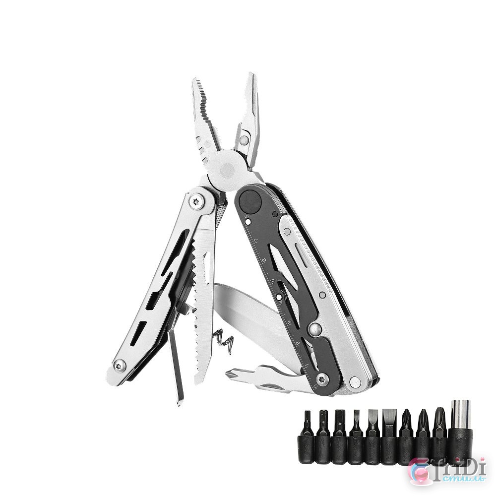 Универсальный мультитул пригодится в туристическом походе, в экстренной ситуации, для ремонта или решения бытовых и рабочих вопросов.Полноразмерные ножницы — отличительная особенность модели G304. Их можно снять с корпуса мультитула и использовать как самостоятельный инструмент. Чтобы отделить ножницы, нужно сначала достать крестовую отвертку, которая служит для них своеобразным фиксатором. Затем одним движением руки ножницы вытаскиваются из пазов — и готовы к работе.Длина лезвия 75 мм.В комплекте нейлоновый чехол и набор из 9 съемных бит.Имеет 8 функций:КусачкиПлоскогубцыНожПилаНожницыШтопорКрестовая отверткаЛинейка