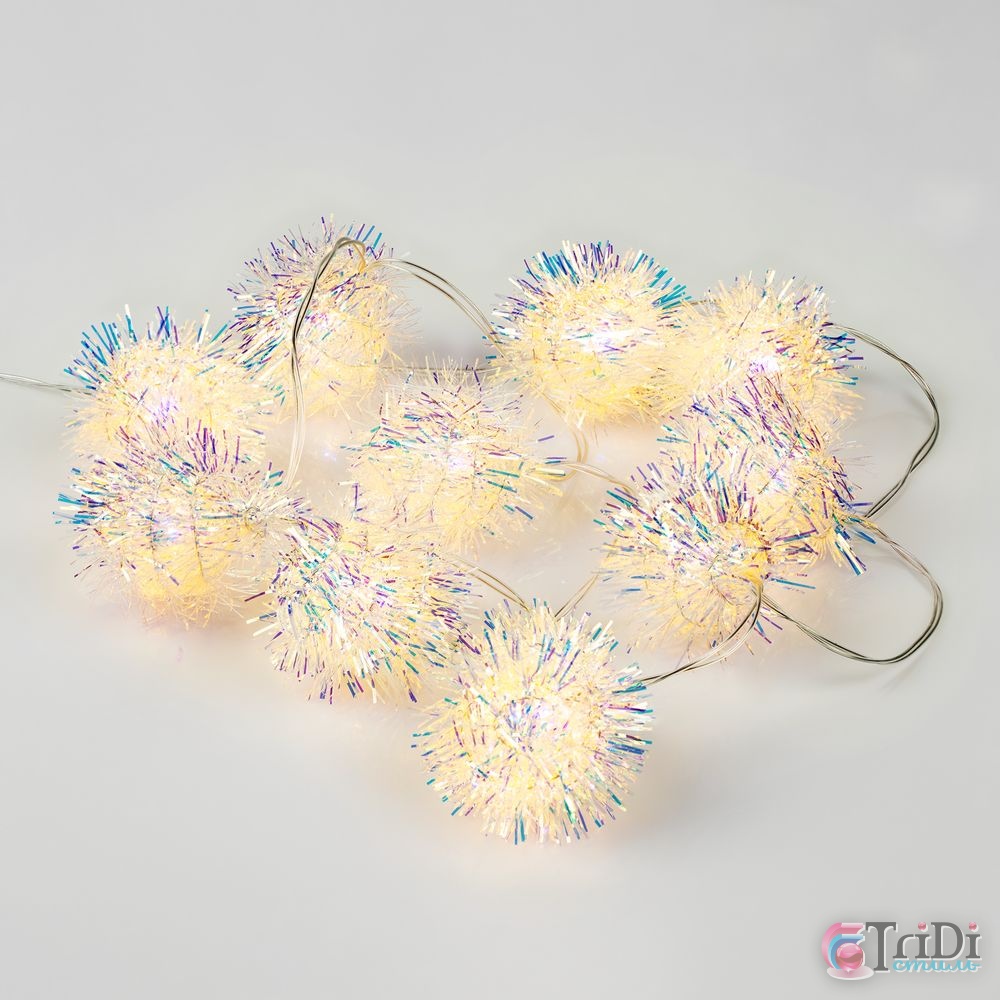 Шепот, нежное шуршание... Огоньки гирлянд! Все это — про гирлянду с мишурой Froufrou, которая совмещает в себе сразу несколько традиционных элементов новогоднего декора. Светящиеся милые снежки, украшенные мишурой, добавляют озорного настроения и конечно, приятного праздничного шуршания, без которого не обойтись в преддверии Нового года!10 помпонов с мишурой с лампочками теплого света. Работает от 2 батареек АА (в комплект не входят).