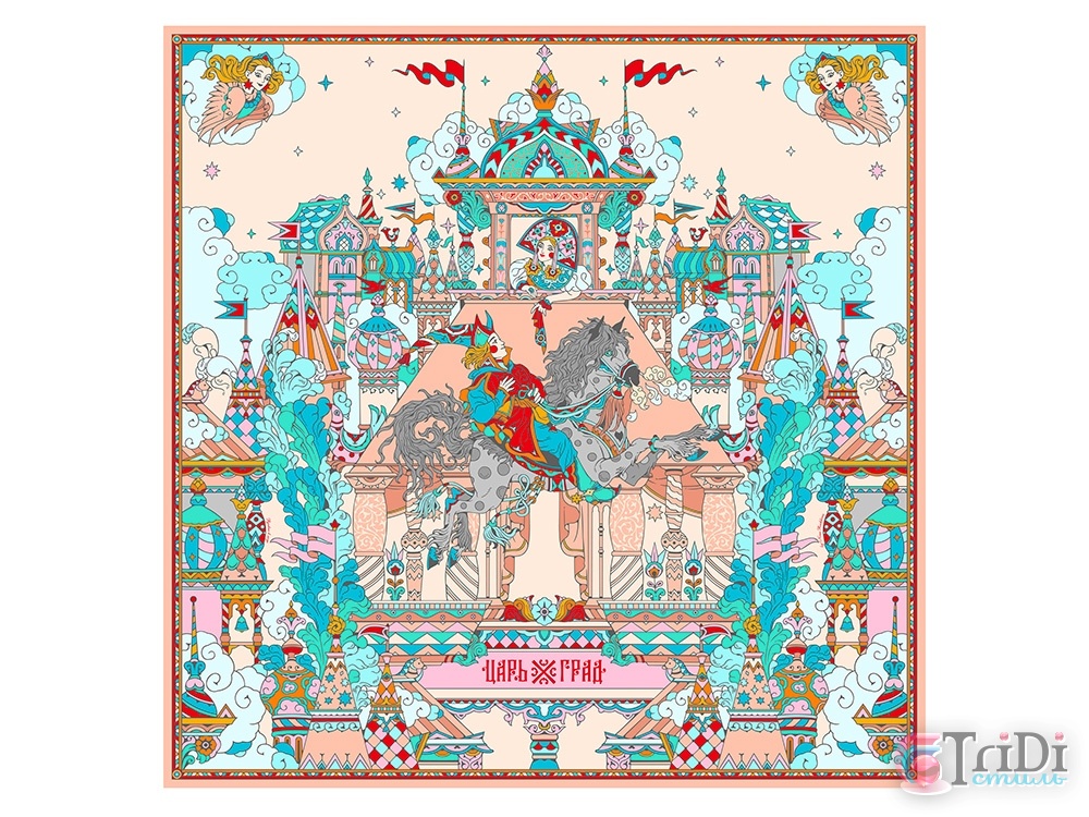 Платок Царьград создан в партнерстве с одноименным загородным курортом, где чтут лучшие обычаи русского гостеприимства. Дизайн платка обращен к воплощению народной традиции чародейства и сказки. Сюжет иллюстрирует фольклорную сцену из произведения Сивка-Бурка о победе истинного чувства и исполнении желаний.