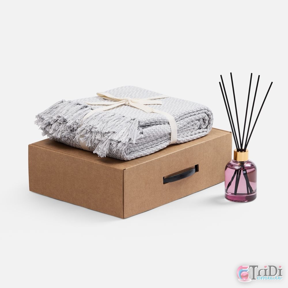 | Материал | плед - хлопок 80%, полиэстер 20%, плотность 260 г/м?; флакон - стекло, палочки из файбера; коробка - микрогофрокартон |