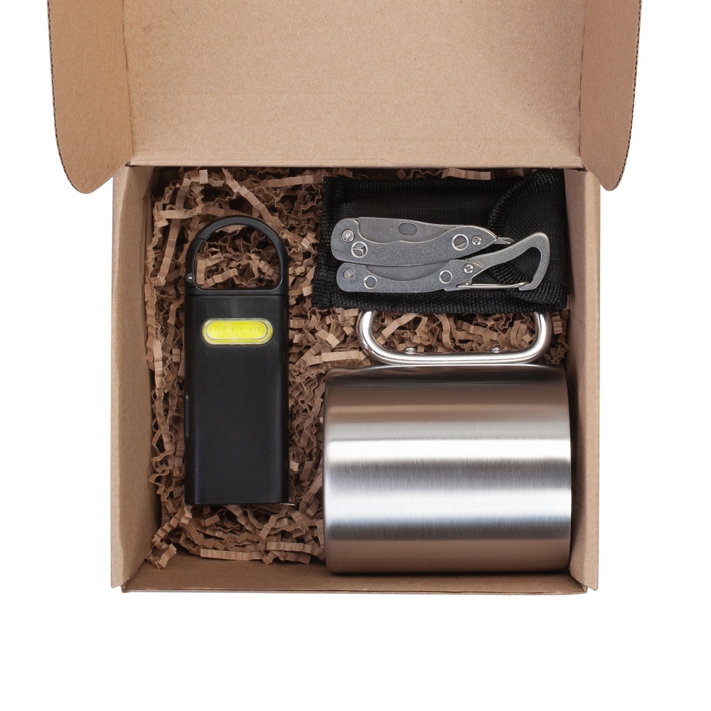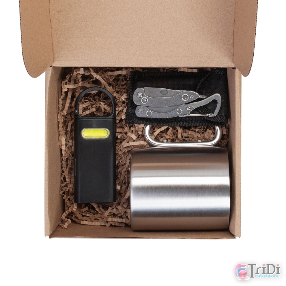 В набор входит: кружка "Огайо" 1032 (объем 300 мл, размер 9 х d 7,5 см); мультитул "Duty" 9в1 5420-7 (размер 8,4 х 1,3 х 2,8 см); фонарик "Spark" 6799 (размер 4 х 11,2 х 1,4 см); гофрированный 30 гр, крафт (плотность 80 гр, ширина 4 мм); коробка 3386 (размер 17,6 х h 8,3 х 15,3 см).