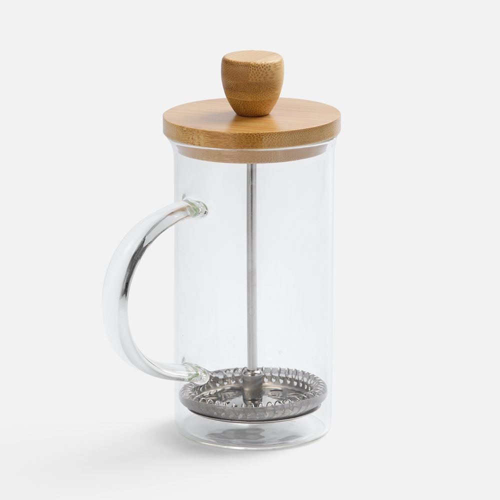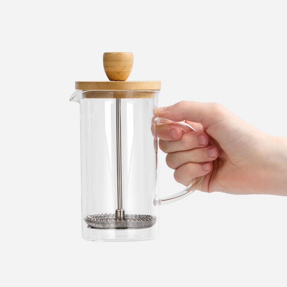 Френч-пресс с изящным сочетанием прозрачного боросиликатного стекла и натурального дерева станет стильным акцентом на кухне. Эргономичная ручка и удобная деревянная крышка с поршнем обеспечивают легкость и комфорт в использовании. Благодаря прочному прозрачному стеклу можно наблюдать за процессом заваривания, наслаждаясь каждым этапом приготовления насыщенного и ароматного чая. Френч-пресс Alba — идеальный выбор для тех, кто ценит качество, элегантность и натуральные материалы в повседневных кухонных аксессуарах. Сделайте каждое утро особенным с чашкой любимого чая!Емкость 350 мл.Поставляется в индивидуальной транспортной коробке.