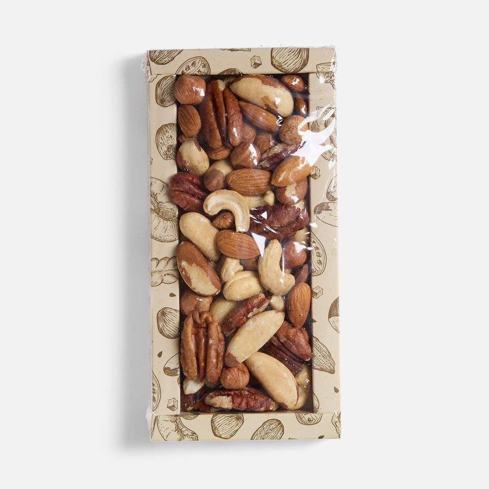 Состав: ядро бразильского ореха, орех пекан, ядро фундука, ядро миндаля, орех кешью.Вес 150 г.Срок годности 12 месяцев.