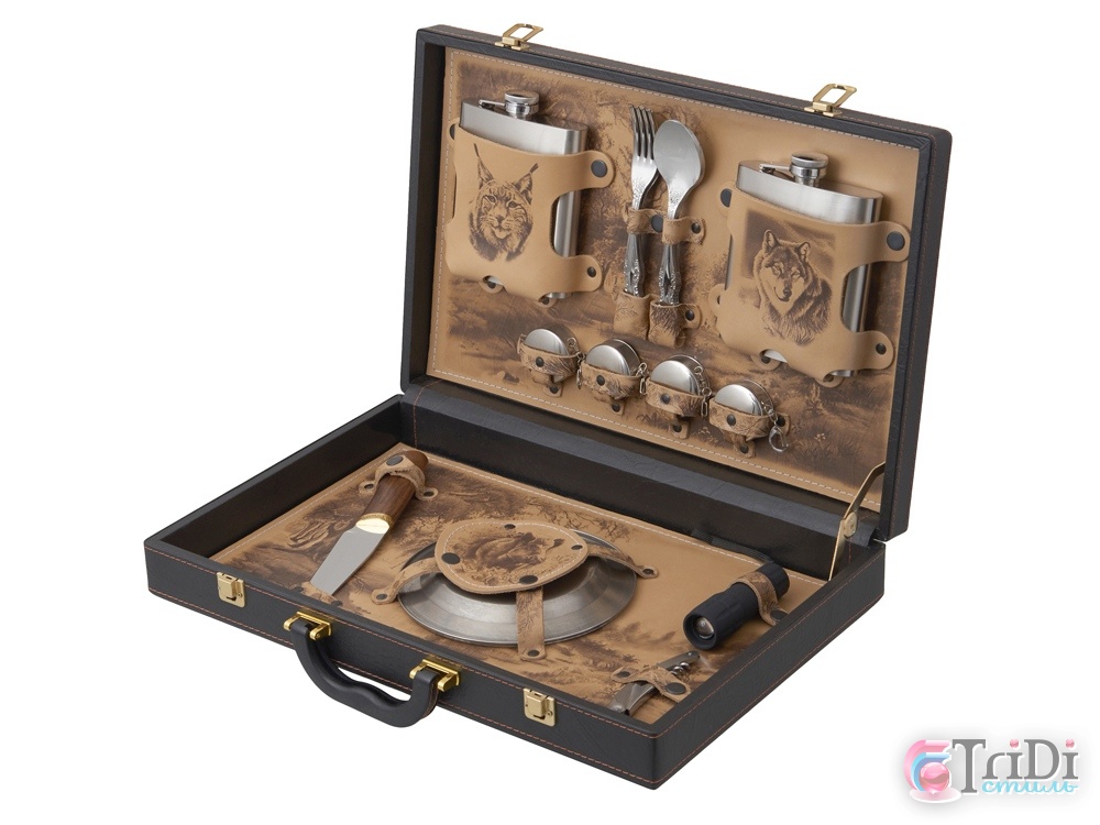 Все комплектующие упакованы в кейс из сплит-кожи с внутренней отделкой из натуральной кожи, украшенной художественным выжиганием. Обратите внимание, что художественное выжигание может отличаться от представленного на фото, так как это ручная работа, что делает каждый экземпляр по-настоящему уникальным.