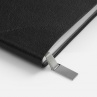 Ежедневник с гибкой обложкой, выполнен из материала Petrus, черный АА, дополнен серым ляссе с металлическим шильдиком.Блок 951, без календарной сетки и информационного блока: Кол-во страниц — 256;Бумага — белая, плотность 70 г/м?;Форзац и нахзац — белыеОбрез блока — серебристый.